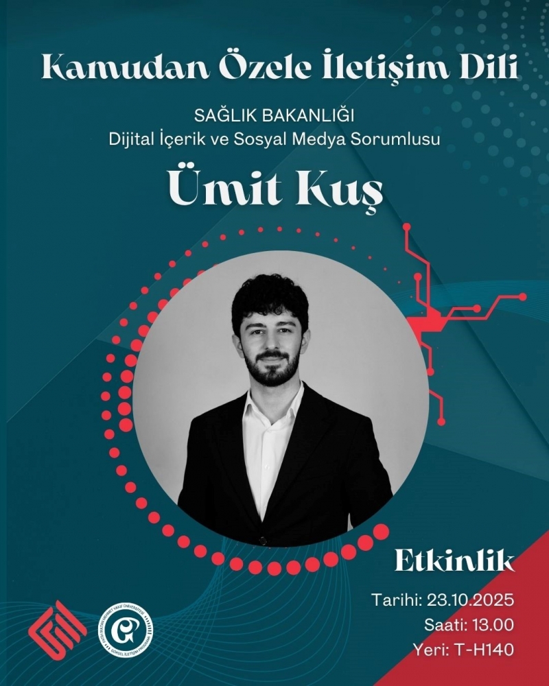 Sağlık Bakanlığı Dijital İçerik ve Sosyal Medya Sorumlusu Ümit KUŞ, 23 Ekim 2025 tarihinde Topkapı Kampüs'te "Kamudan Özele İletişim Dili" başlıklı seminer ile öğrencilerimizle bir araya geldi.